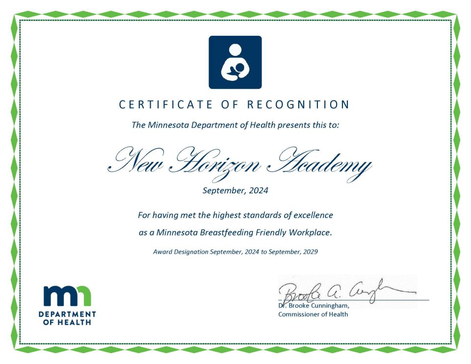 PLYMOUTH, Minnesota — New Horizon Academy has been named a Breastfeeding-Friendly Workplace by the Minnesota Department of Health (MDH).